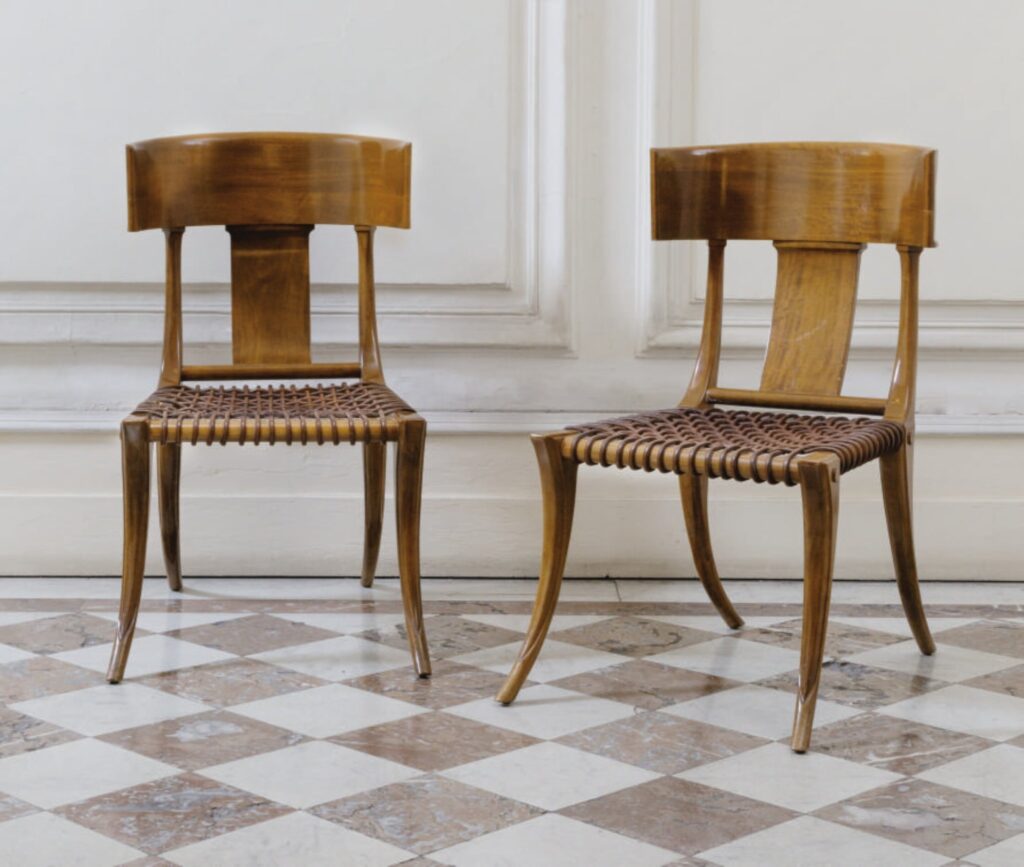 El la cultura griega la silla “Klismos” fue uno de los muebles más representativos. Este diseño es una referente importante para el desarrollo de la silla en espacios cotidianos. Lo más representativo de este, fue su forma curva lograda en un material rígido como lo es la madera de olivo, criprés o cedro a las que se le agregaban aplicaciones de cuero y piel.